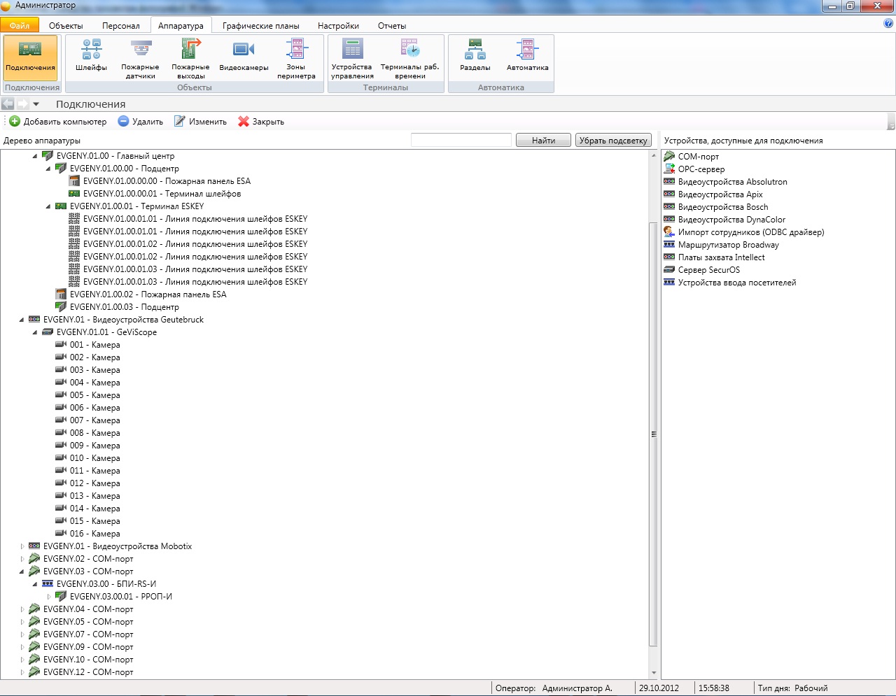Программный модуль «Администратор» является обязательным компонентом ПО «ESELTA». Программа предназначена для конфигурирования всех систем комплекса. В данном программном модуле выполняется ввод данных о структуре оборудования, определяется структура помещений и дверей, назначаются права на доступ в помещения, назначаются права на снятие и постановку помещений под охрану, назначаются права сотрудникам на запуск приложений и многое другое.