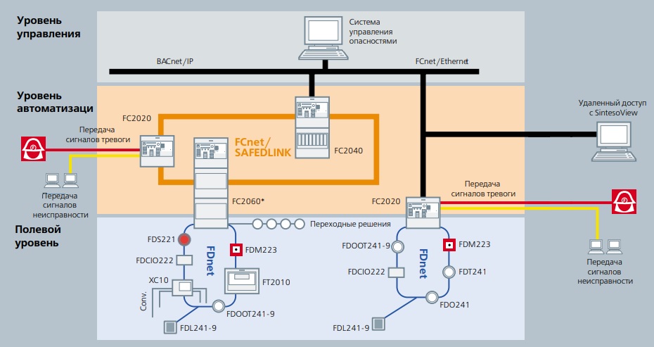 Sinteso™ предлагает две мощные сети – FCnet и FDnet. В сеть можно подключить до 32 FCnet-станций (панелей и терминалов). Поэтажные пульты, детекторы и другие периферийные устройства подключаются через FDnet. На уровне управления систему обнаружения пожара можно эффективно интегрировать в компьютерную систему управления опасностями с помощью стандартного интерфейса (BACnet).   На уimageровне автоматизации противопожарные панели семейства Sinteso гарантируют, что все сигналы и действия в сети будут эффективно обработаны. Кроме того, FCnet можно расширить с помощью подключения к Ethernet панелей управления для создания различных сетей. На  уровне периферии передовые извещатели пожаров, поэтажные пульты и прочие устройства подключаются через FDnet. Данная сеть поддерживает не только связь между устройствами, но также обеспечивает их электропитание.