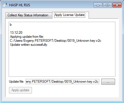4. Запустить утилиту HASPRUS, перейти во вкладку "Apply License Update", указать путь к файлу и нажать кнопку "Apply update":